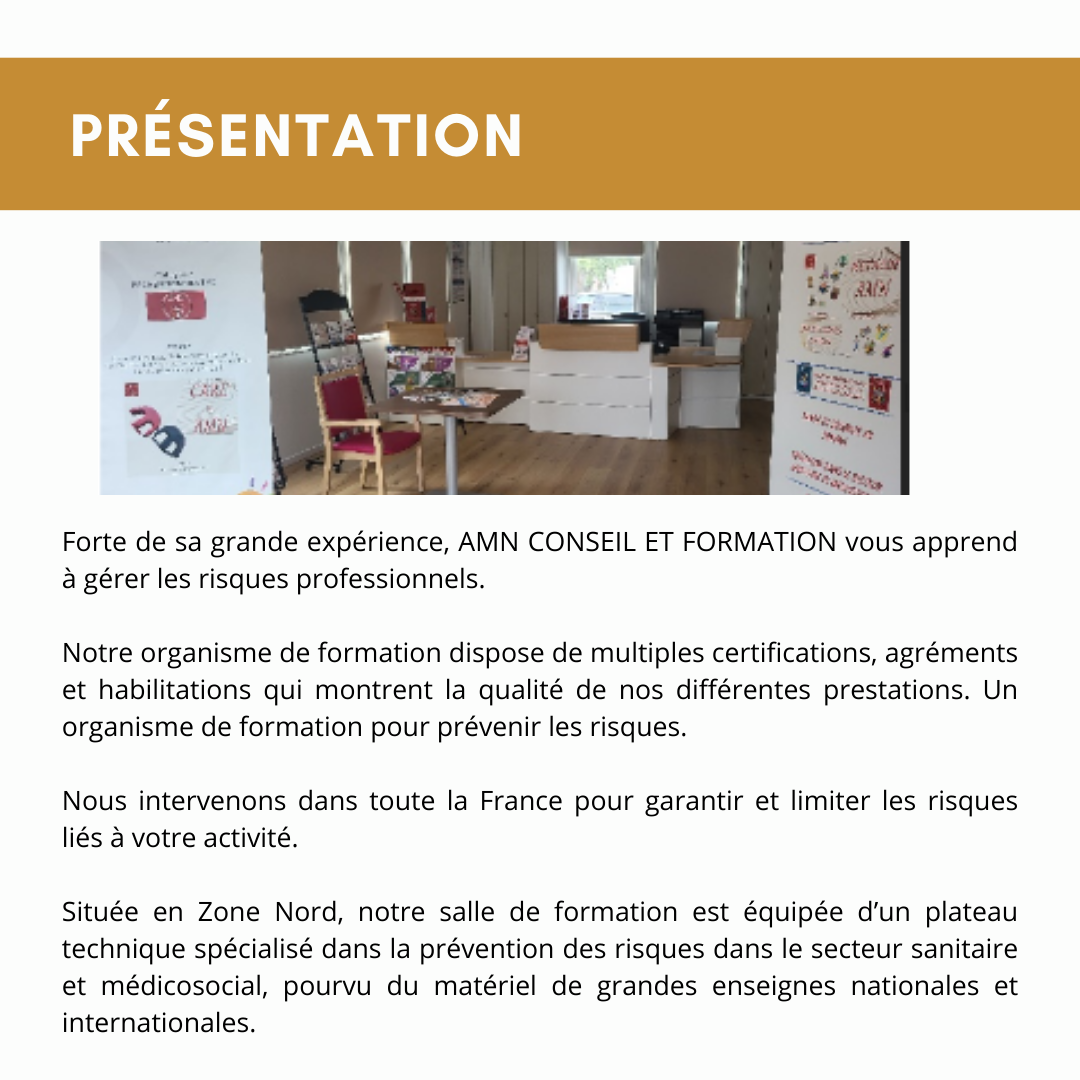 L'équipe d'AMN Conseil et Formation, composée d'ergonomes, de consultants et d'intervenants en prévention des risques professionnels (IPRP), intervient dans toute la France pour garantir et limiter les risques liés aux activités professionnelles.