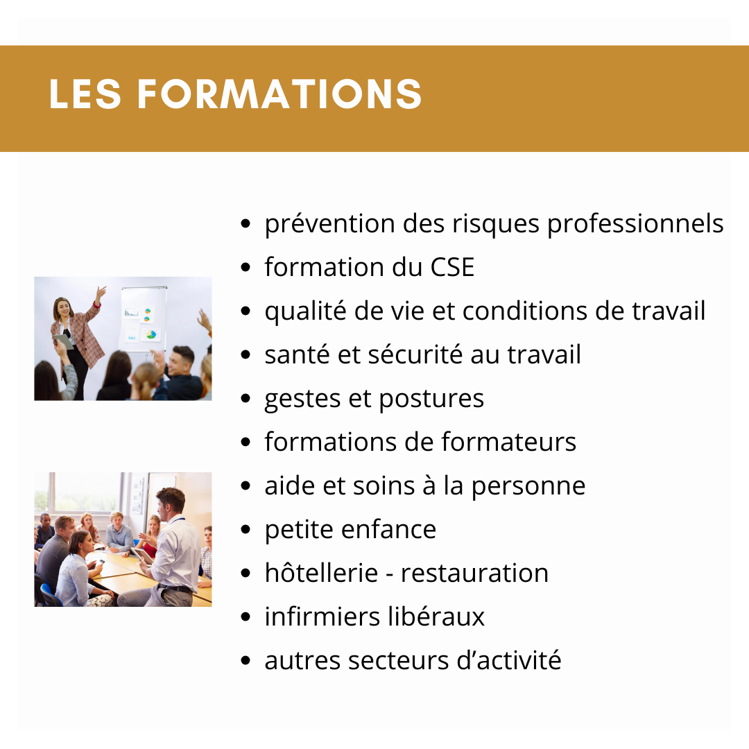 Elle propose une gamme complète de formations certifiantes, notamment en prévention des risques liés à l'activité physique (PRAP), prévention des risques psychosociaux (RPS), prévention des troubles musculosquelettiques (TMS) et gestion des risques chimiques et biologiques.