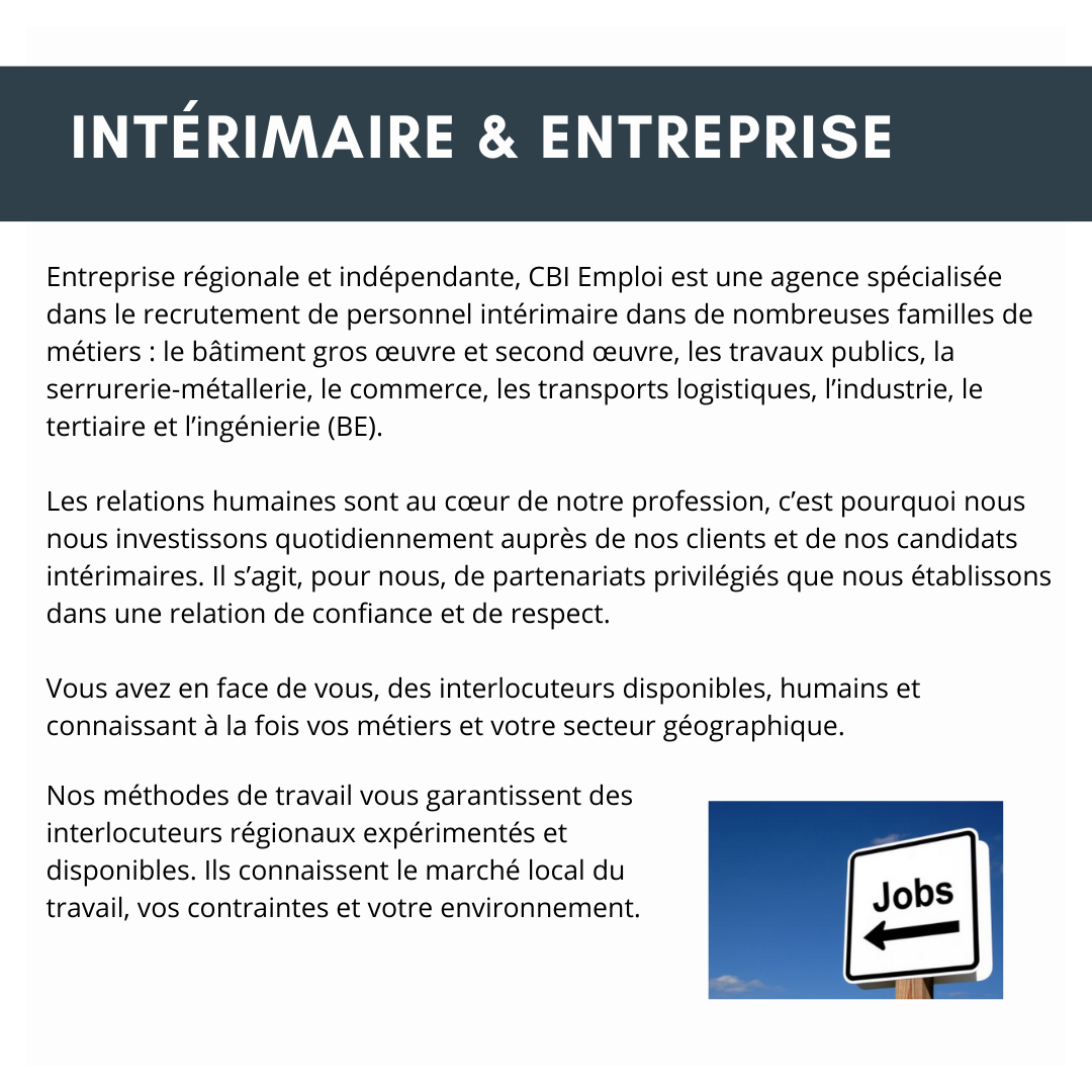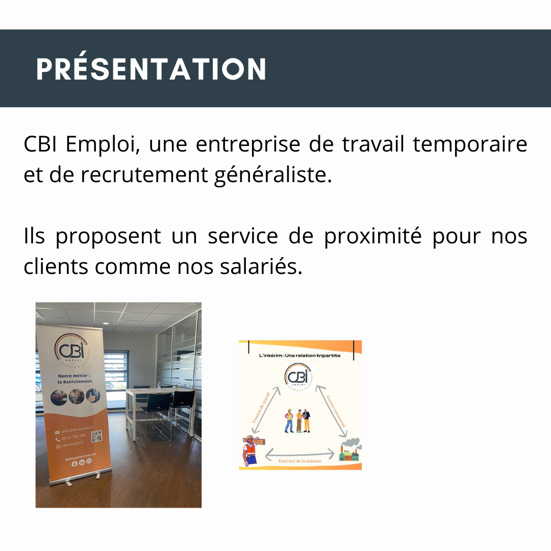 Fondée en 2021, elle s'appuie sur une équipe d'experts en ressources humaines, offrant des services tels que la délégation de personnel temporaire, la gestion de contrats et le recrutement en CDI. Dirigée par Christophe Miralles, fort de près de 20 ans d'expérience dans le domaine, CBI Emploi met en avant des valeurs d'indépendance, d'agilité, de proximité et de réactivité pour répondre aux besoins des entreprises et des candidats.